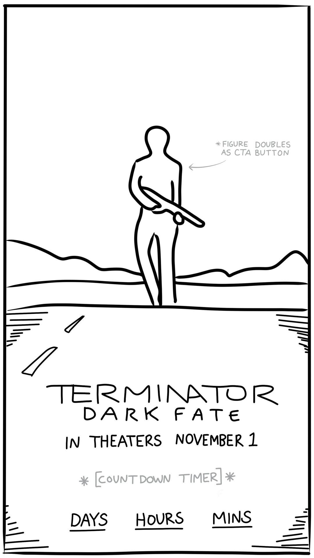 Paramount Pictures requested a proposal for a mobile ad announcing the upcoming release of Terminator: Dark Fate. Key performance indicators were awareness and engagement. The concept needed to excite the user while showcasing elements of the Terminator franchise. The challenge was that no assets were available except for a poster and trailer.