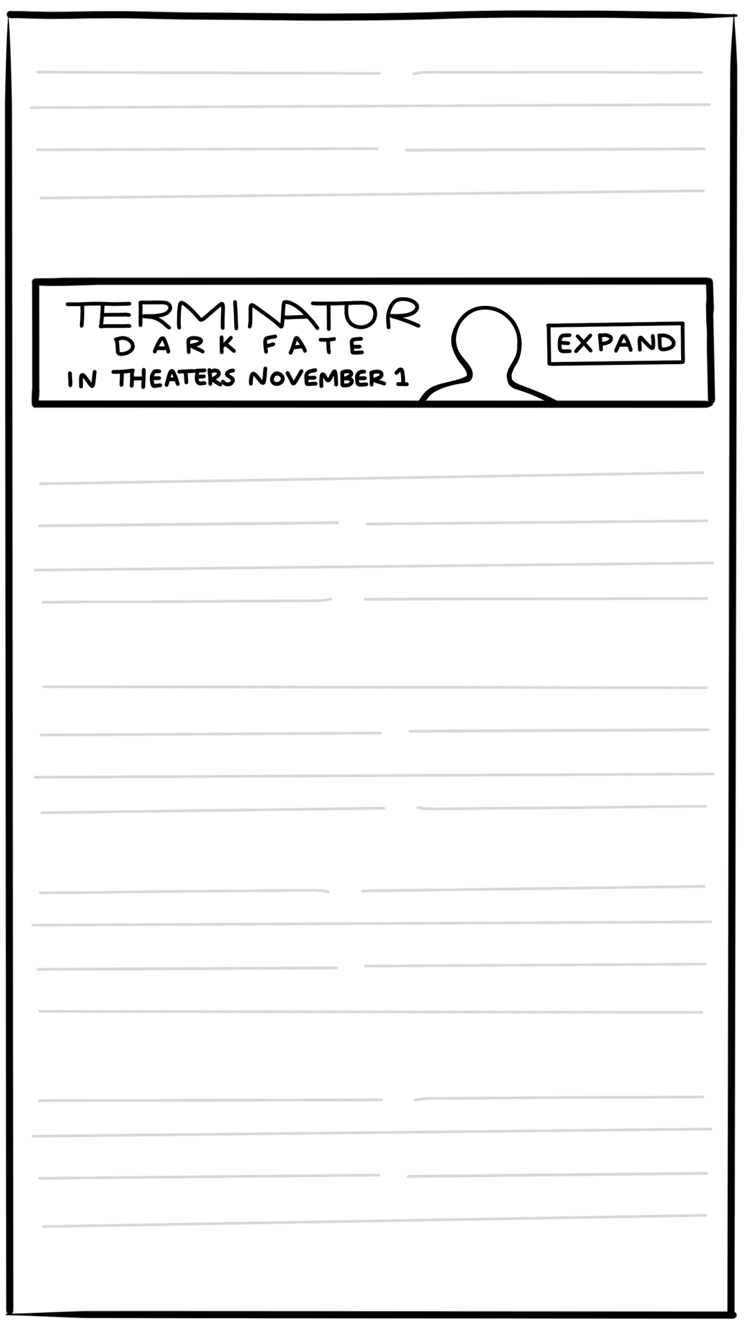 I wanted to create an experience where the user views the ad from the perspective of a Terminator robot. What starts as a standard mobile display banner brings the user into the world of Terminator through three main states, tied together with animated transitions and homemade graphic elements.